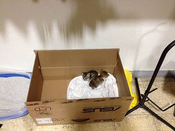 原本還把兩個紙箱弄連在一起,一個是給他們放貓砂上廁所用的
